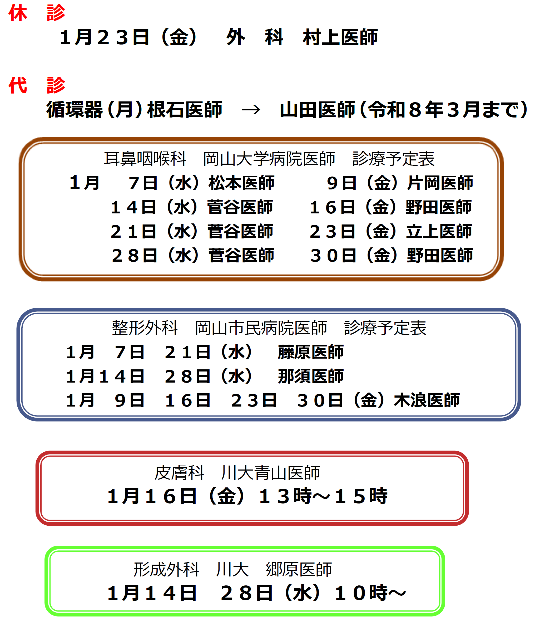 代診・休診のお知らせ(1月)